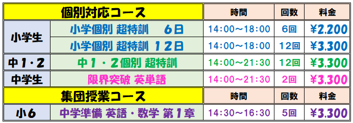 小中の個別超特訓は、通い放題コース通塾生は教材費のみで参加可能。