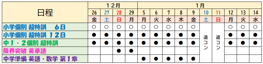 小学個別超特訓6日は〇の日程からお好きな6日をご選択いただきます。
